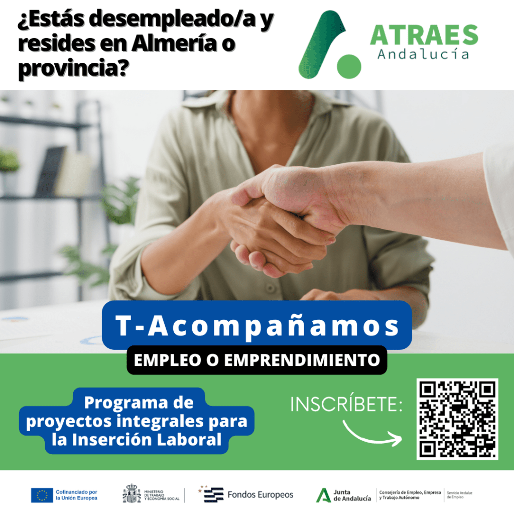 T-Acompañamos, va orientado hacia la inserción laboral y comprende las actuaciones de información, orientación profesional, motivación, asesoramiento, diagnóstico y determinación del perfil profesional y de competencias, diseño y gestión de la trayectoria individual de aprendizaje, búsqueda de empleo, intermediación laboral y, en resumen, las actuaciones de apoyo a la inserción de las personas beneficiarias. Asimismo, ofrecemos asesoramiento y formación en materia de autoempleo para los participantes que quieran emprender. Además, este programa cuenta con un incentivo por la participación de 528 € por haber desarrollado y finalizado su Itinerario, y siempre que exista una valoración positiva por parte del personal técnico.